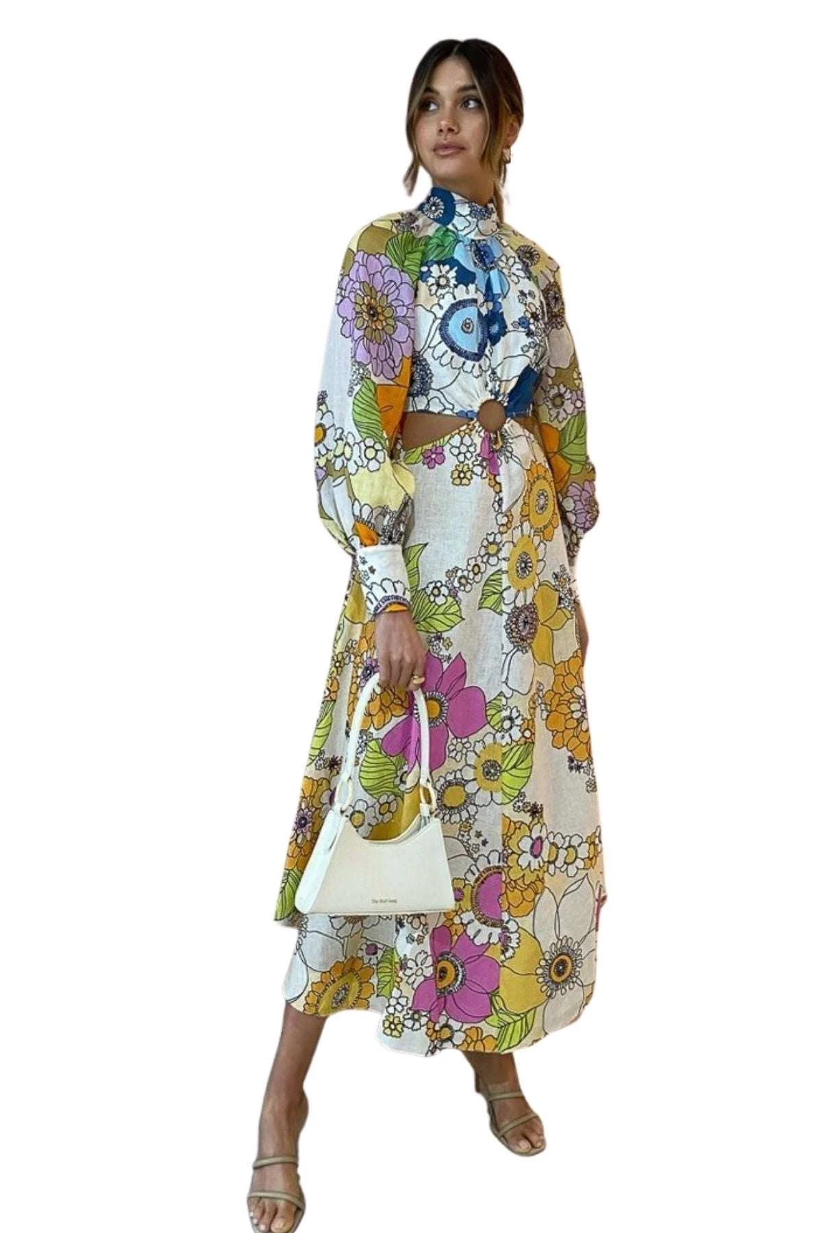 Crafted from a 100% Linen fabrication, this A-line midi dress features a high neckline and long blouson sleeves which is perfectly balanced with an O-ring detail and waist cut outs. An effortlessly feminine silhouette for your spring summer wardrobe.