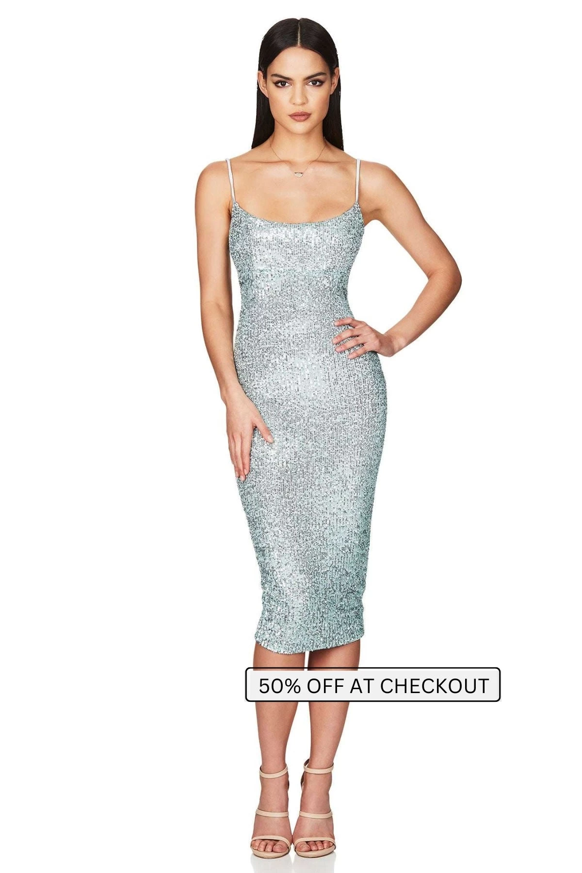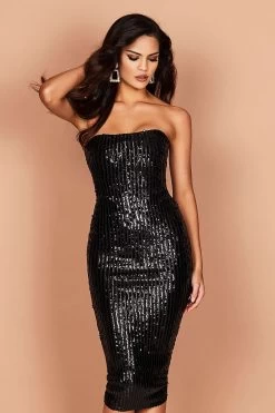 Create the ultimate shape in our beautifully crafted sequin midi dress. Crafted from stretch sequin fabric, featuring in built bra padding for the ultimate support and subtle lift, invisible center back zipper and adjustable straps.