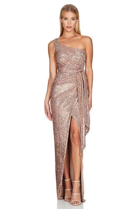 Striking one shoulder gown with asymmetrical wrap skirt and waist tie. Cut from luxe stretch sequin, fully lined. Invisible zipper at centre back.