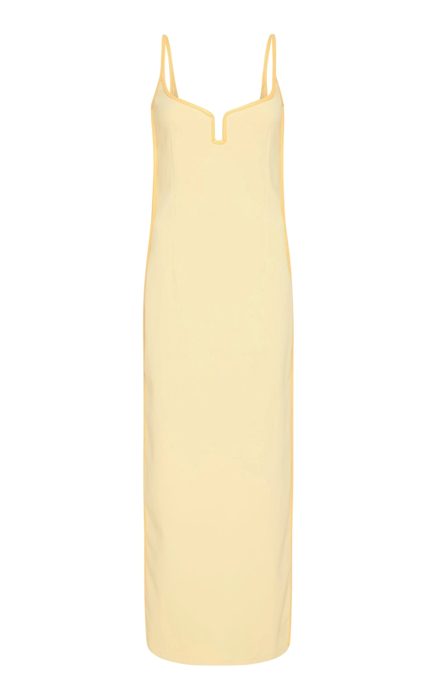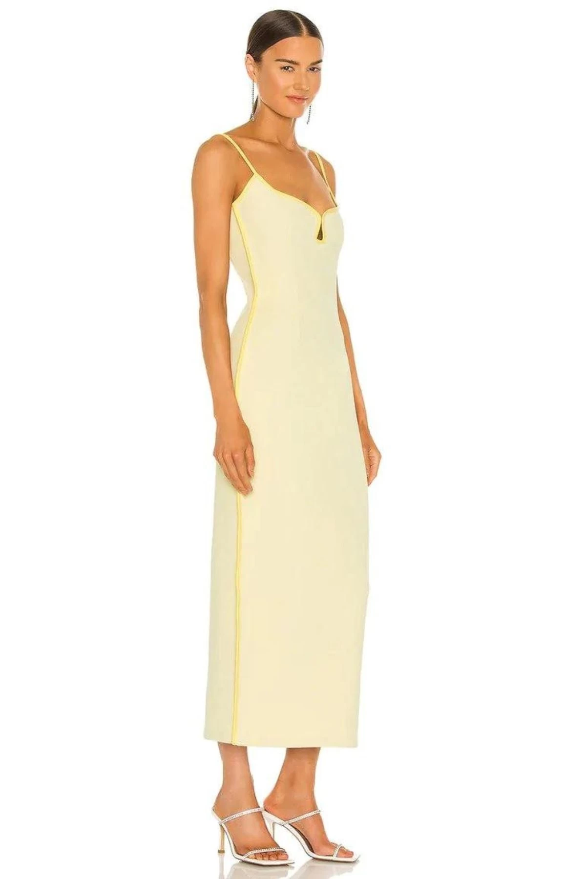 The Marlo dress by trendy designer Paris Georgia features a unique geometrical neckline. In its gorgeous daffodil shade of yellow, this dress is an absolute statement. yellow leather trim adds a luxurious edge.Â