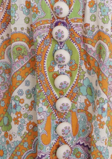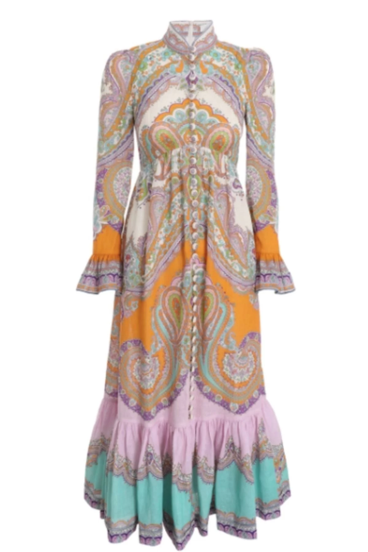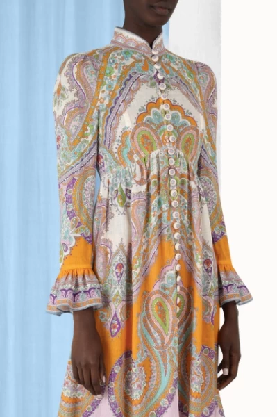Gorgeous linen dress with a stand up collar, feature buttons and Zimmermann signature paisley print.