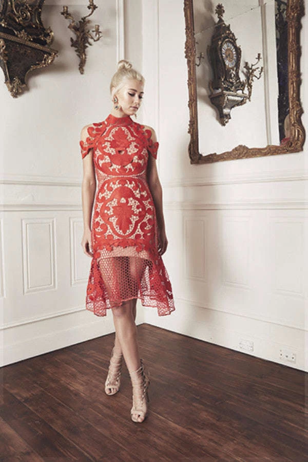 Stunning, intricately rose embroidered midi dress with a flattering flared hemline. Vibrant red overlay is paired with a nude lining for a sophisticated & beautiful look. Sheer cut-outs on the waist and shoulders provide a slimming silhouette.Â