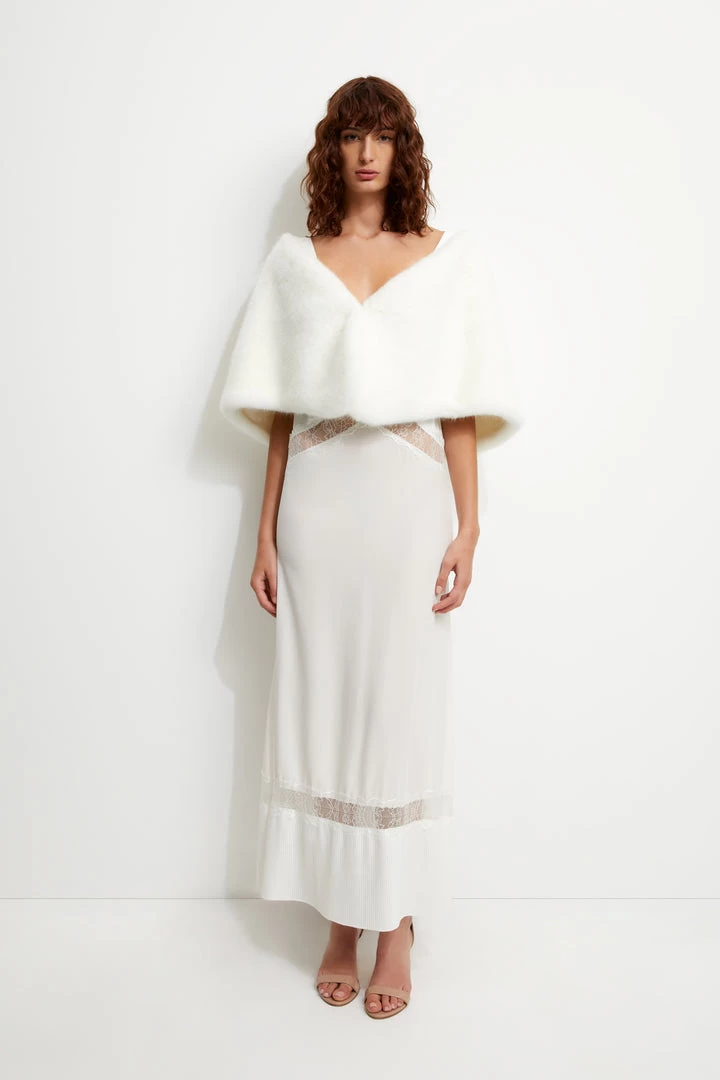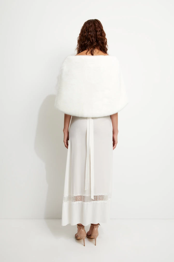 SIMPLE AND ELEGANT, THE YASMINE WRAP IS A TIMELESS PIECE TO COMPLEMENT ANY GOWN OR BRIDESMAID DRESS. THIS STYLE FEATURES SHORT-PILE PLUSH FAUX FUR, INTERIOR SATIN LINING, AND A HOOK CLOSURE FOR AN EFFORTLESS WEAR THROUGHOUT THE DAY AND EVENING.